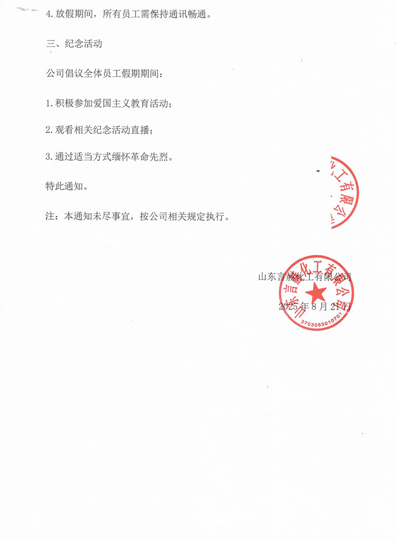 为纪念中国人民抗日战争暨世界反法西斯战争胜利80周年,根据国务院相关通知精神,结合公司实际情况,现将放假安排通知如下: 放假时间:2025年9月3日,放假1天,于2025年9月4日正常上班。 放假期间工厂生产不停工,为方便广大客户联系,各区域销售业务电话保持24小时畅通,并设立了24小时应急电话:18678175321 0533-8955588。